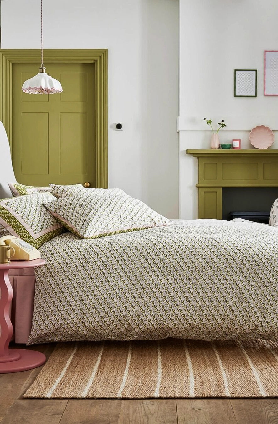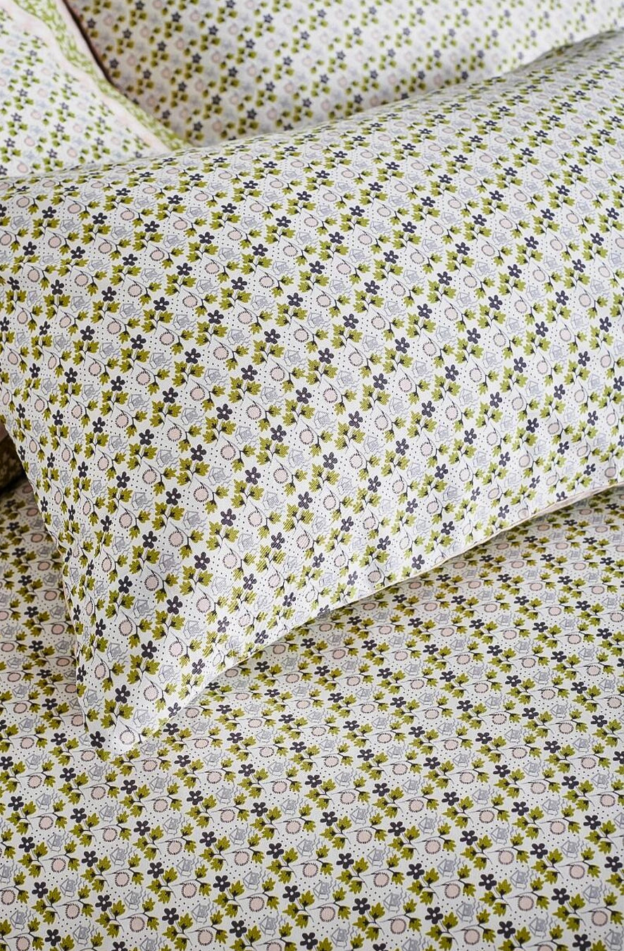 Adu un strop de farmec atemporal și eleganță în dormitorul tău cu lenjeria de pat Vintage Scarf. Inspirată de eșarfele vintage clasice, acest set este decorat cu un imprimeu floral delicat, în nuanțe estompate de verde și roz, încadrat de o bordură rafinată. Confecționată din bumbac, oferă un echilibru perfect între confort și durabilitate, asigurând un somn odihnitor.