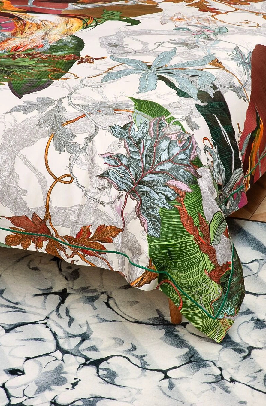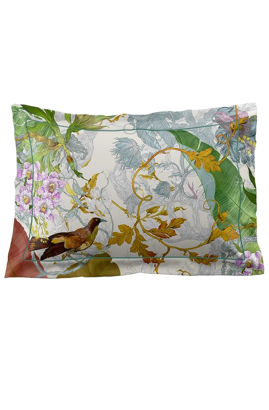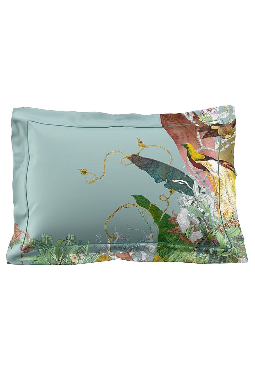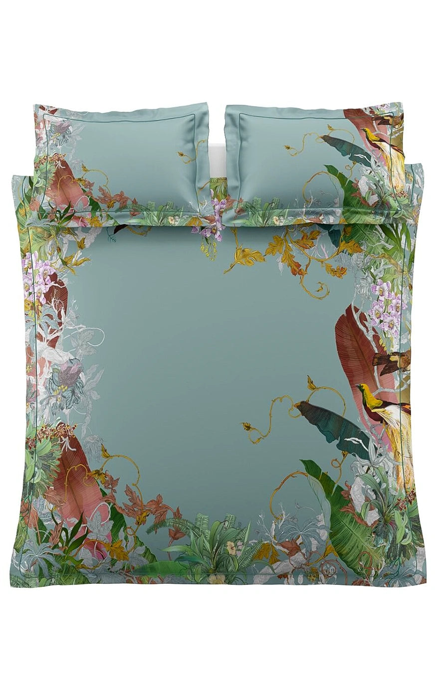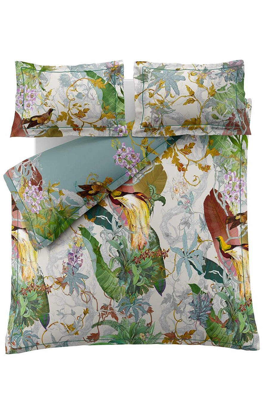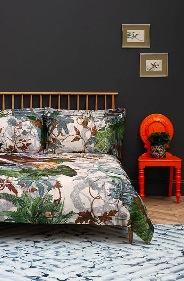 Lenjeria de pat Timorous Beasties Papua Paradise prezintă un design îndrăzneț, maximalist, având ca element central Pasărea Paradisului, inspirată de fauna sălbatică vibrantă din Papua Noua Guinee. Designul surprinde frumusețea exotică a acestei păsări emblematice înconjurată de elemente tropicale luxuriante. Această lenjerie de pat, imprimată pe bumbac satinat luxos, cu textură fină și mătăsoasă, este evidențiată de culorile vii și detaliile complexe ale designului.