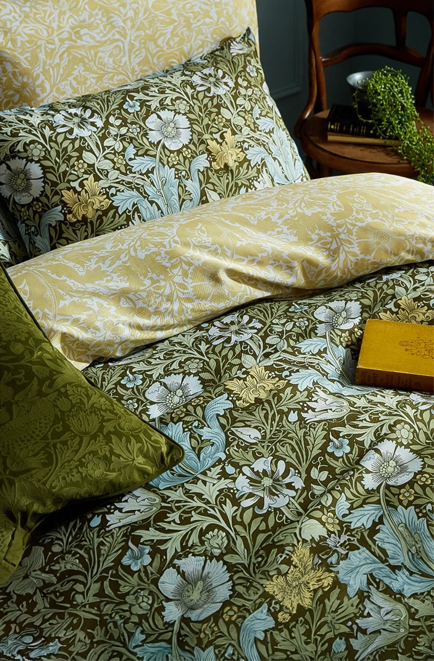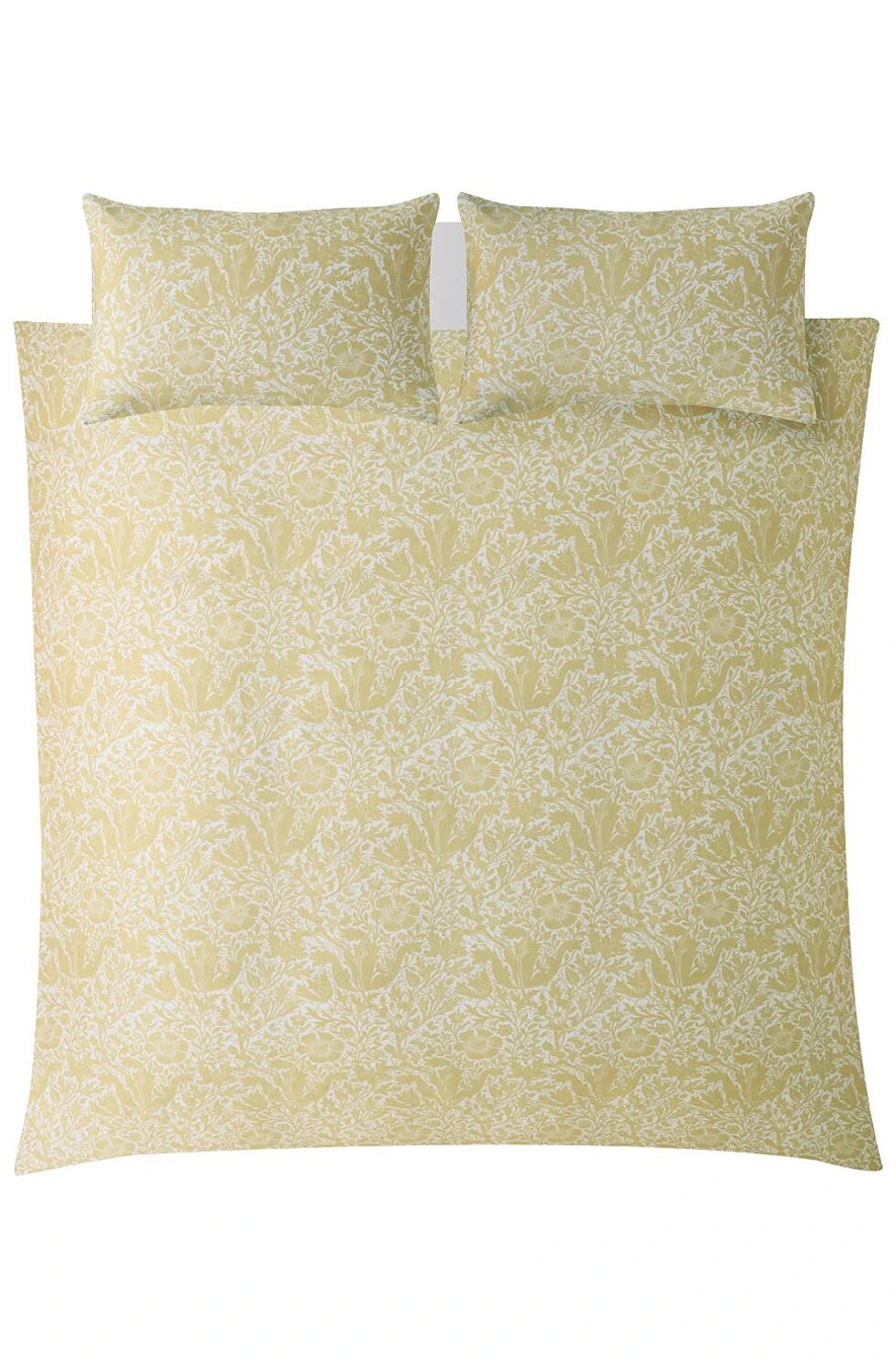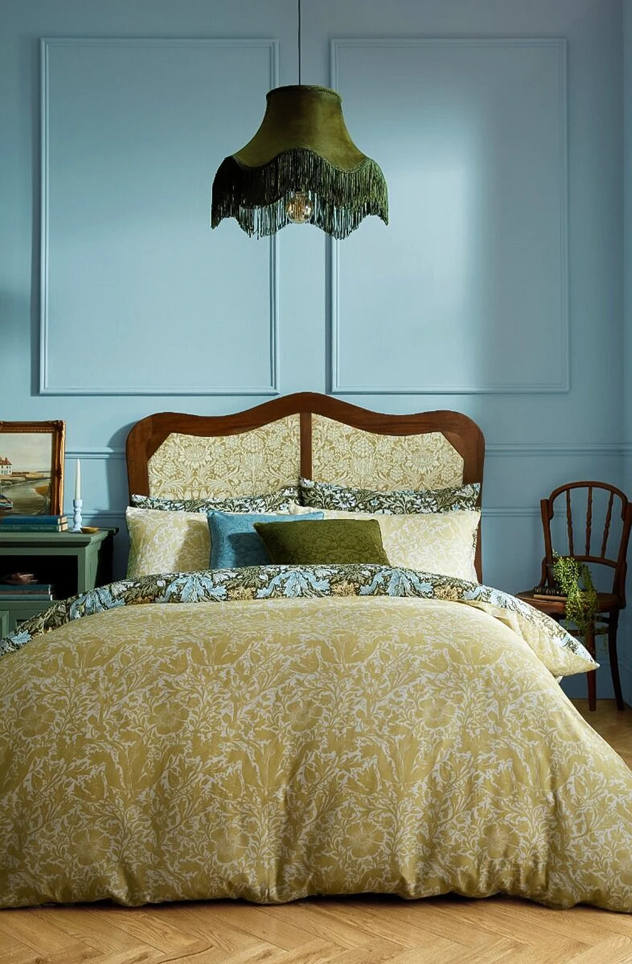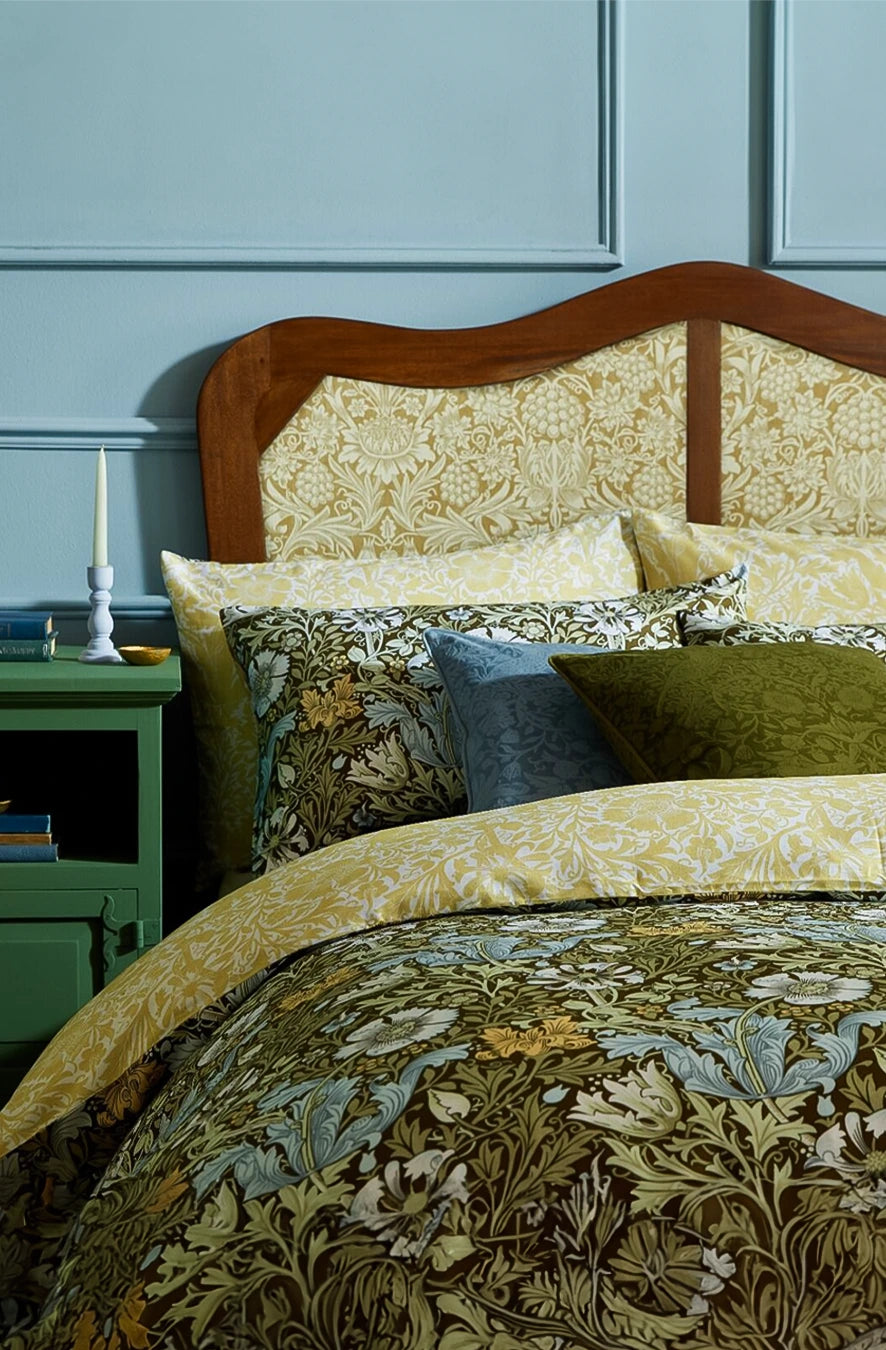 William Morris a căutat să transforme casele cu ajutorul culorilor și modelelor care reflectă frumusețea lumii naturale. Lenjeria de pat Compton prezintă lalele și caprifoi pe fundalul unor straturi bogate de frunziș. Reversul prezintă un imprimeu proaspăt, într-o nuanță caldă de galben, care completează armonios designul.