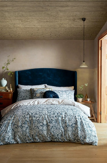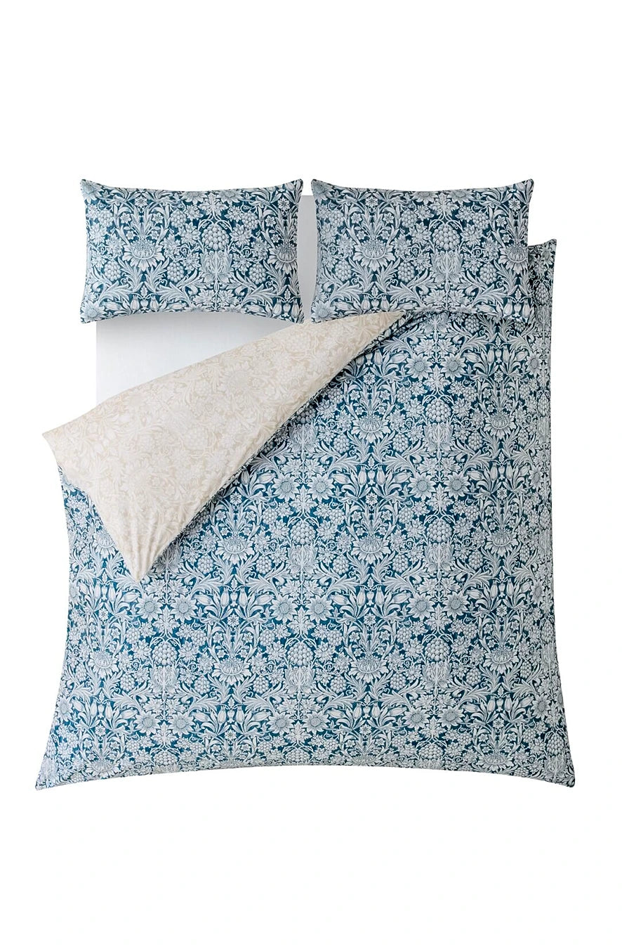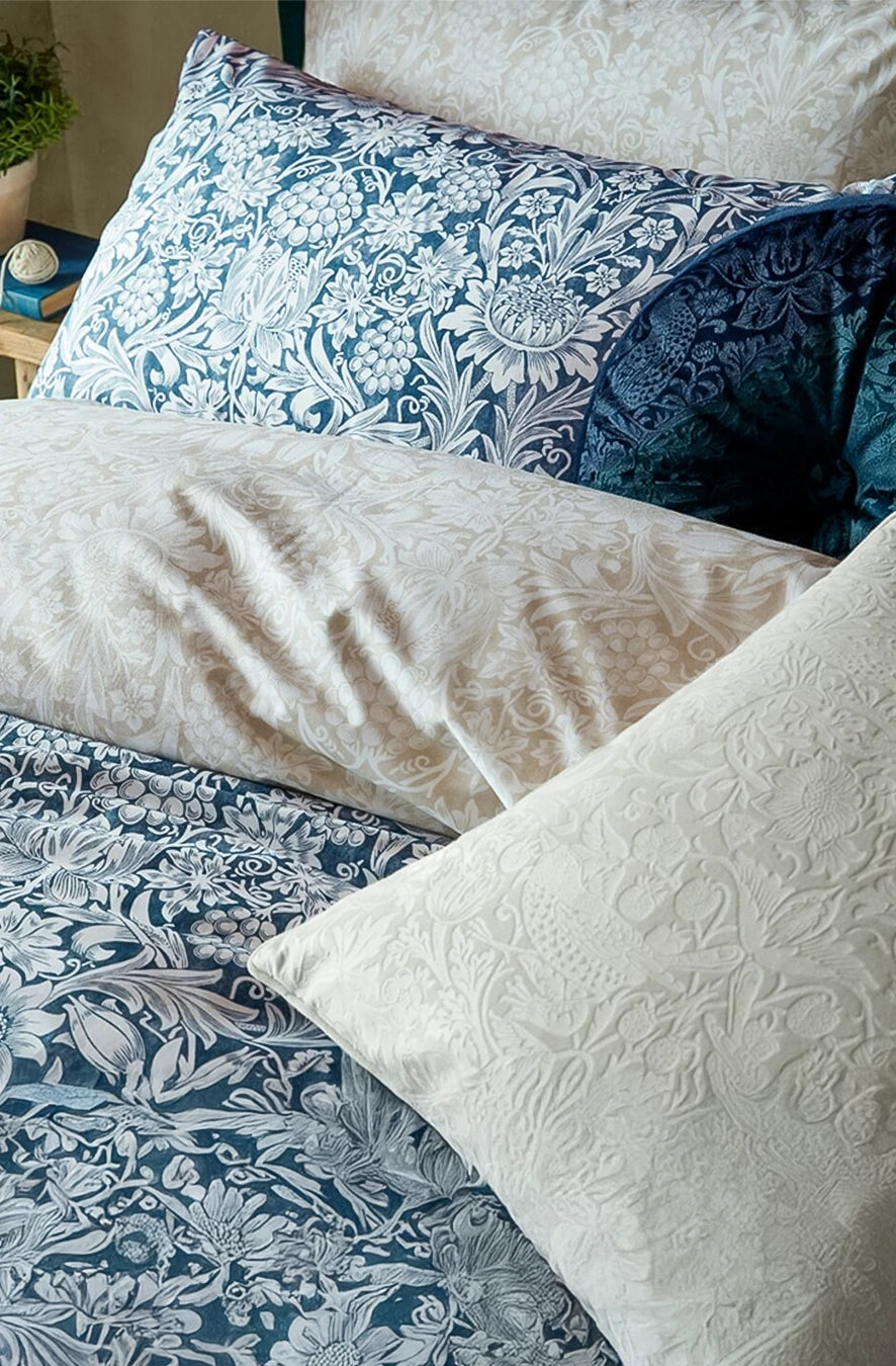 Inspirată din propria grădină a lui William Morris de la Kelmscott Manor, această lenjerie de pat reversibilă este colorată într-o nuanță intensă de albastru cerneală pe față și într-o nuanță delicată de in pe verso. Designul elegant și simetric, imprimat pe o bază de bumbac satinat, prezintă floarea-soarelui, lalele și viță de vie, flori ce aduc natura mai aproape de tine.